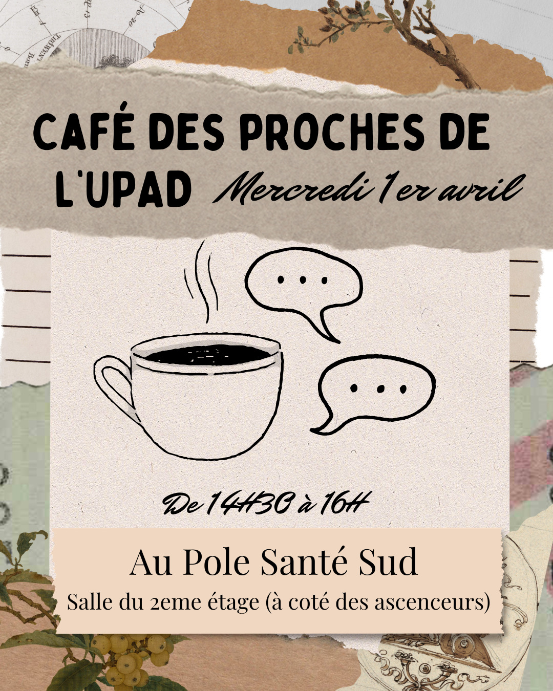 ☕ Pour les proches des résidents de l’UPAD : Café des Proches Mercredi 01 avril 2026, de 14h30 à 16h00 📍 Centre Hospitalier Pôle Santé Sud 37 – salle du 2ème étage 👥Réservé...