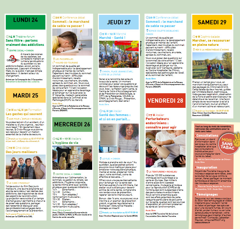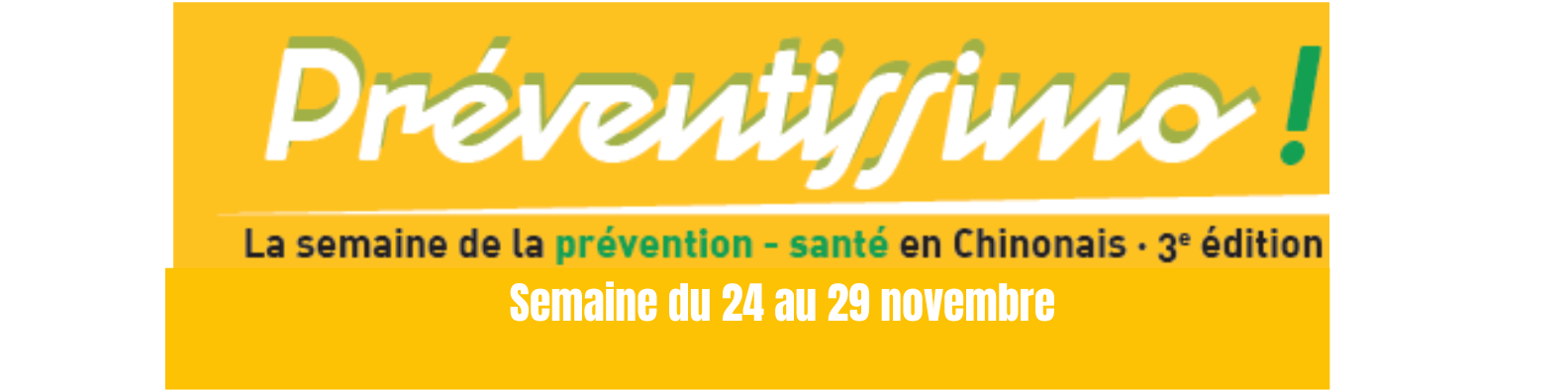 Programme Préventissimo : semaine du 24 au 29 novembre 2025. Pour la troisième année consécutive, le Pays du Chinonais organise la semaine Préventissimo ! La semaine de la prévention - santé. Au programme : ateliers pratiques, conférences, animations variées… Autant d’occasions pour s’informer, échanger et découvrir les acteurs locaux engagés dans la promotion de la santé. Ces rendez-vous sont ouverts à toutes et à tous, sans limite d’âge. N’hésitez pas à en parler autour de vous et à venir en nombre pour échanger et partager vos préoccupations de santé.
